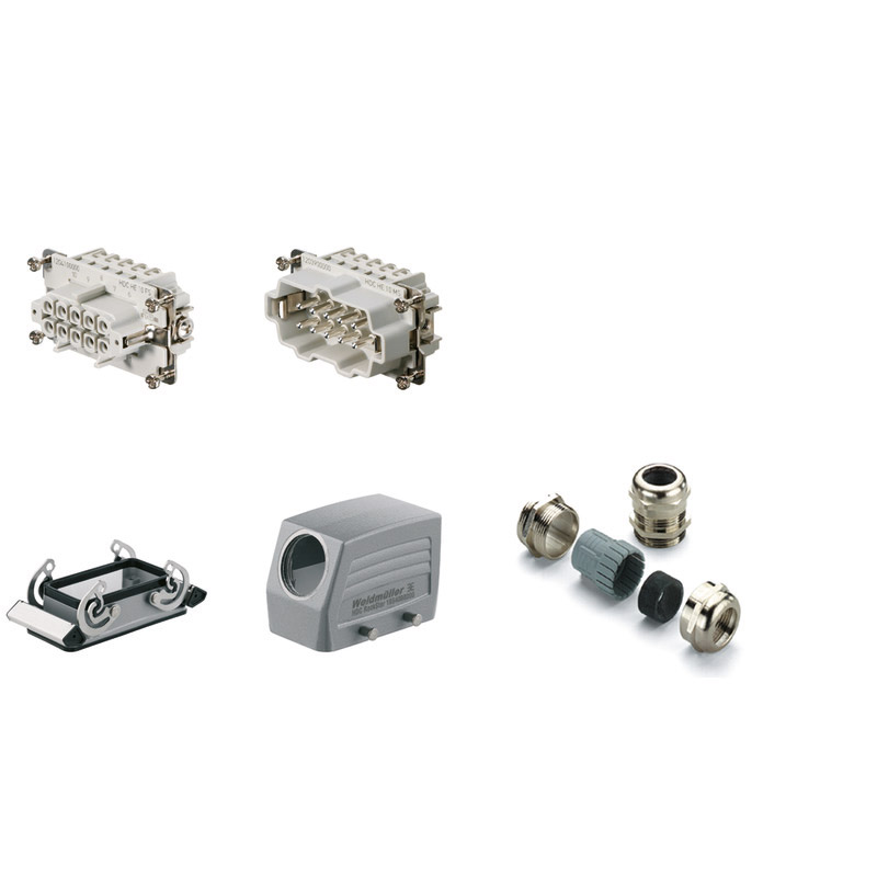 HDC-KIT-HE 10.110 RockStar. Serie HE. KIT de conector industrial. Numero de polos: 10P+PE. Corriente: 16A a una tensión de 500V. Grupo 4. Incluye: Conector hembra (1204100000), conector macho (1203900000), base abierta (1205000000), capota con salida lateral (1654070000), glandula de latón(1569100000). Temperatura de operación: -40°C~125°C.