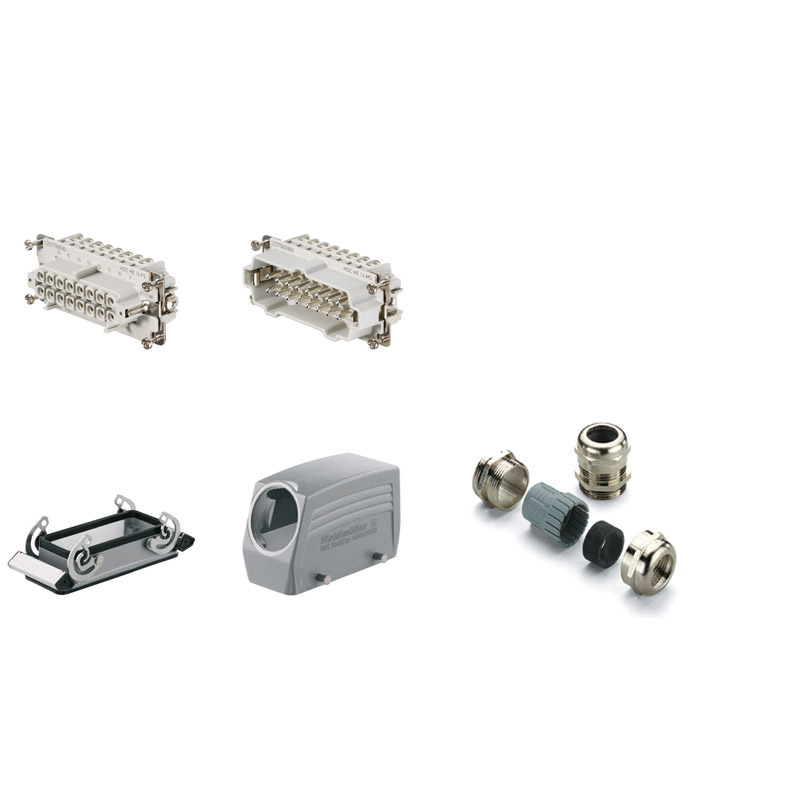 HDC-KIT-HE 16.120 RockStar. Serie HE. KIT de conector industrial. Numero de polos: 16P+PE. Corriente: 16A a una tensión de 500V. Grupo 6. Incluye: Conector hembra (1207700000), conector macho (1207500000), base abierta (1208600000), capota con salida lateral (1656480000), glandula de latón(1569110000). Temperatura de operación: -40°C~125°C.