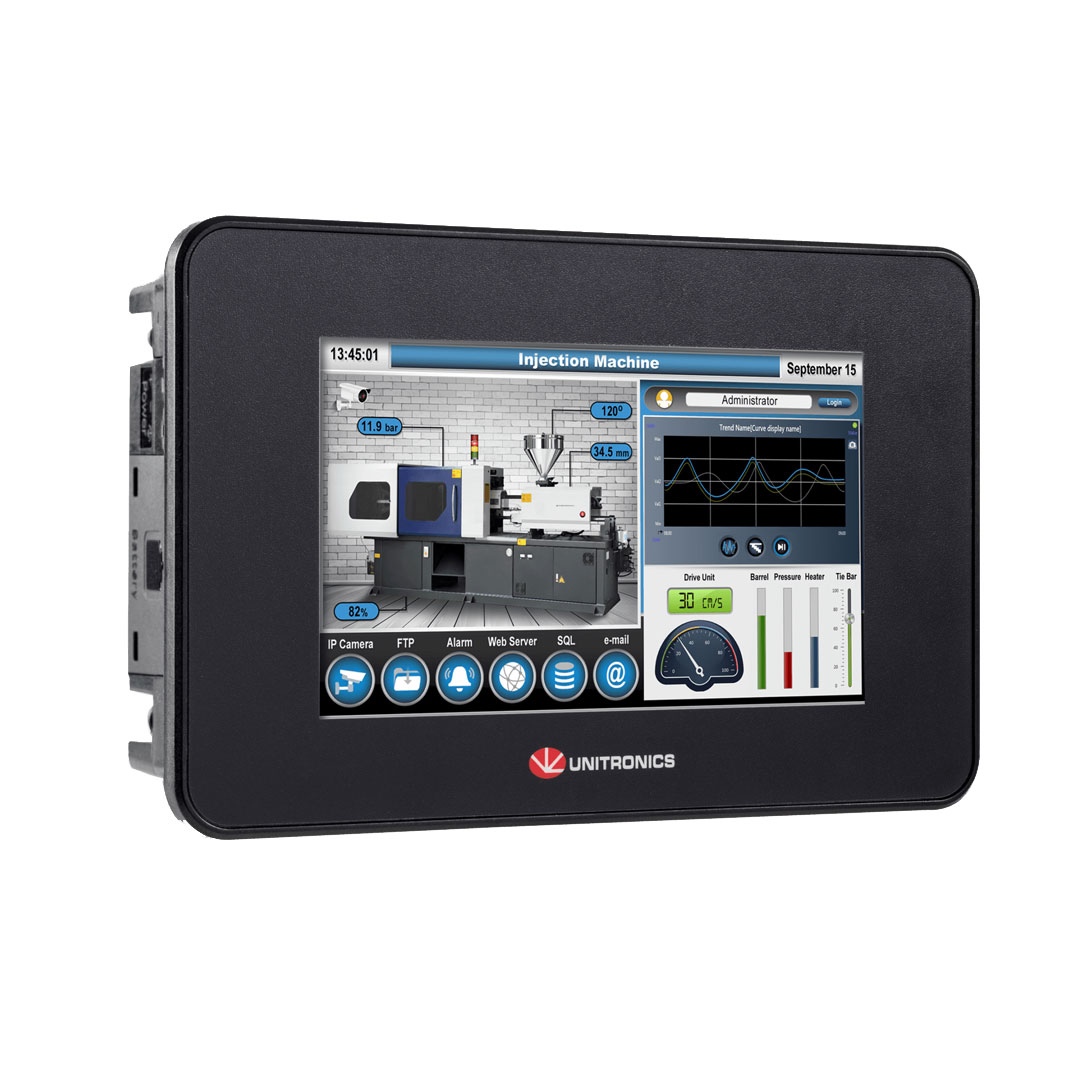 PLC con Pantalla HMI compacto, display LCD táctil 800x480 (SVGA), área visual 5" 65k Colores, soporta hasta 5 módulos Uni-I/O ó Uni-COM, 1 puerto microSD, 1 puerto USB, 1 puerto Ethernet. 14 entradas digitales , 2 entradas alta velocidad, 2 entradas analogas, 2 entradas termocupla/PT100, 8 salidas relé y 2 salidas análogas. Alimentación 24 VDC, protección IP65/IP66 y NEMA4X. Permite Web Server, conexión SQL y reproducción de audio y video.