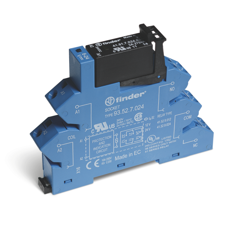 38.41.7.024.9024 Interfaz modular con relevador de estado solido (SSR) con 14mm de ancho. Tensión de control de 24VCD. Un contacto abierto 1NA con capacidad de carga de 5A a 24VCD. Montaje en riel DIN 35mm. Se compone de relevador 41.81.7.024.9024 y base 93.52.7.024. Aprobaciones: CE, UKCA, CSA, IMQ, RINA, UL
