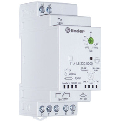 11.41.8.230.0000 Relé para el encendido de lámparas en función de la luminosidad ambiental, se suministran con sensor fotosensible externo. Funciones: . Tensión de mando de 230VCA. Equipado con contactos 1CO. Material de los contactos: plata oxido de estaño (AgSnO2). Indicado para una corriente nominal de 16A a tensión de 250VCA. Dimensiones: 84Hx35Wx60.8Dmm. Montaje en Riel DIN. Temperatura de operación -20°C~50°C. Aprobaciones: . Protección IP20.