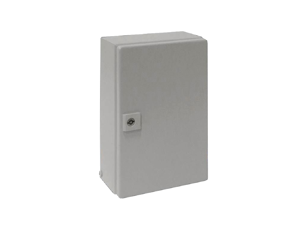 1554.000 KX E-Box Caja pequeña con puerta abisagrada de chapa de acero. Dimensiones: 300x200x120mm. Unidad de embalaje: caja con puerta, placa de montaje, cierre de aldabilla con bombín de doble paletón de 3 mm, bisagra de 180º. Grado de protección IP66, NEMA 12. Aprobaciones: Bureau Veritas, DNV-GL, GOST, Lloyds Register of Shipping, UL + C-UL (listed).