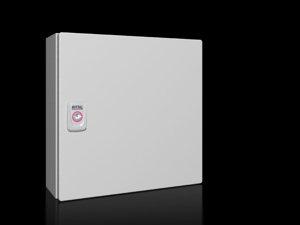 1555.000 KX E-Box Caja pequeña con puerta abisagrada de chapa de acero. Dimensiones: 300x300x120mm. Unidad de embalaje: caja con puerta, placa de montaje, cierre de aldabilla con bombín de doble paletón de 3 mm, bisagra de 180º. Grado de protección IP66, NEMA 12. Aprobaciones: Bureau Veritas, DNV-GL, GOST, Lloyds Register of Shipping, UL + C-UL (listed).