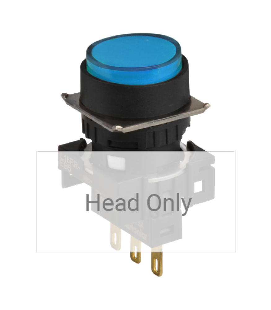 L16RR-EB Indicador luminoso tipo luz piloto. Para orificio de montaje de 16mm de diámetro. Diseño saliente. Color azul. Unidad básica (Cabezal con adaptador), los módulos LED se venden por separado. Grado de protección IP65.