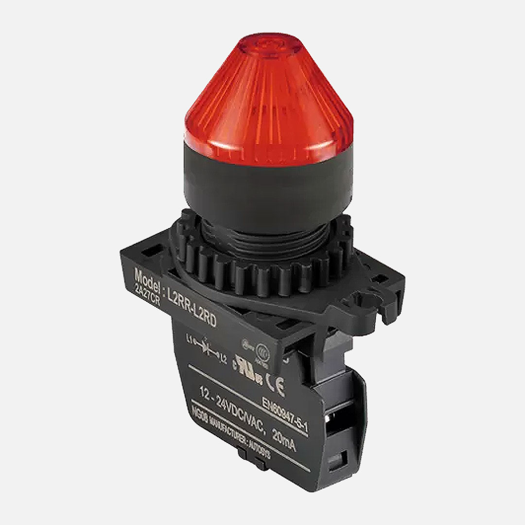 L2RR-L2RD Indicador luminoso tipo luz piloto. Para orificio de montaje de 22mm de diámetro. Diseño saliente tipo conico. Color rojo. Unidad completa (Cabezal con adaptador y módulo LED singular), el módulo LED se alimenta a 12-24VAC. Grado de protección IP52.
