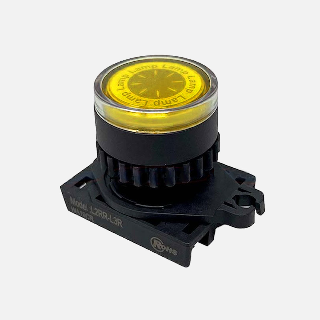 L2RR-L3Y Indicador luminoso tipo luz piloto. Para orificio de montaje de 22mm de diámetro. Diseño saliente redondo plano. Color amarillo. Unidad básica (Cabezal con adaptador), los módulos LED se venden por separado. Grado de protección IP52.