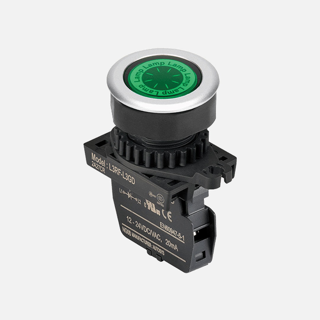 L3RF-L3GL Indicador luminoso tipo luz piloto. Para orificio de montaje de 30mm de diámetro. Diseño rasante redondo plano. Color verde. Unidad completa (Cabezal con adaptador y módulo LED singular), el módulo LED se alimenta a 110-220VAC. Grado de protección IP52.