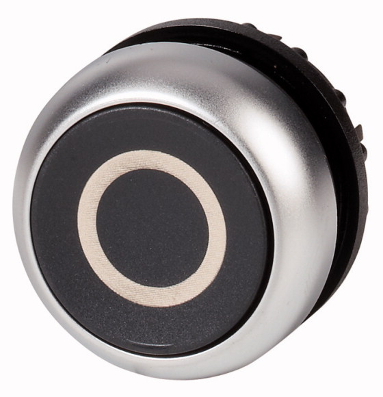 M22-D-S-X0 RMQ-Titan Botón pulsador con inscripción -0-. Para orificio de montaje de 22mm de diámetro. Diseño plano con accionamiento momentáneo. Color negro con bisel color plata. Unidad básica (requiere adaptador y módulos de contacto). Grado de protección IP66, IP67, IP69.