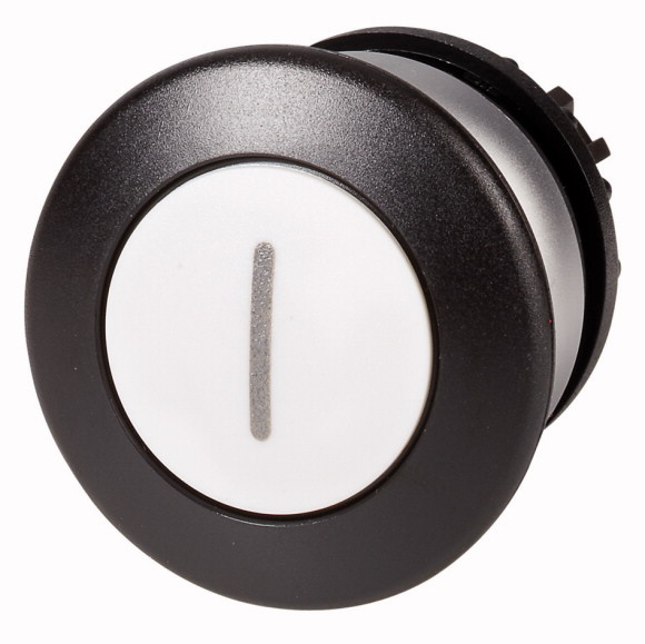 M22-DP-W-X1 RMQ-Titan Botón pulsador con cabezal tipo hongo con inscripción -I-. Para orificio de montaje de 22mm de diámetro. Diseño hongo con accionamiento momentáneo. Color de cabezal negro, placa de Botón blanco, bisel plata. Unidad básica (requiere adaptador y módulos de contacto). Grado de protección IP66, IP67, IP69.