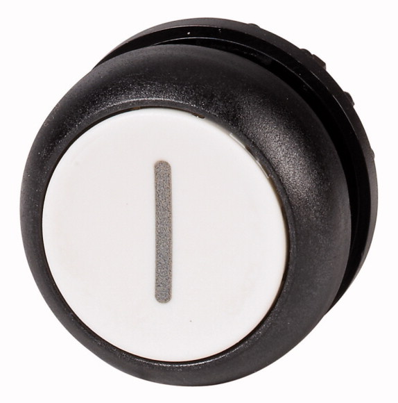 M22S-D-W-X1 RMQ-Titan Botón pulsador con inscripción -I-. Para orificio de montaje de 22mm de diámetro. Diseño plano con accionamiento momentáneo. Color blanco con bisel color negro. Unidad básica (requiere adaptador y módulos de contacto). Grado de protección IP66, IP67, IP69.
