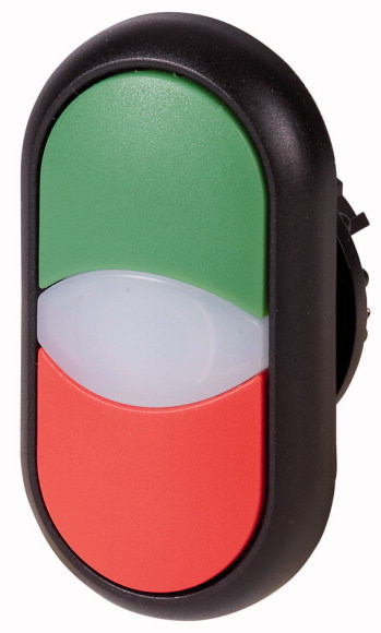 M22S-DDL-GR RMQ-Titan Botón doble Iluminado. Para orificio de montaje de 22mm de diámetro. Diseño plano con accionamiento momentáneo. Color verde/rojo con bisel color negro. Unidad básica (requiere adaptador, módulos de contacto y/o modulo luminoso). Grado de protección IP66.
