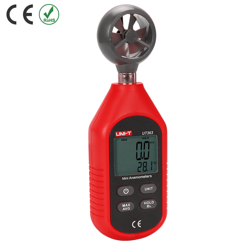 Mini anemómetro. Valores máximos de medida: 0-30m/s, -10°-50°C, Wind 0-12. Características: MAX/AVG, retención de datos, retroiluminación LCD, apagado automático, indicador de sobrecarga, indicación de batería baja