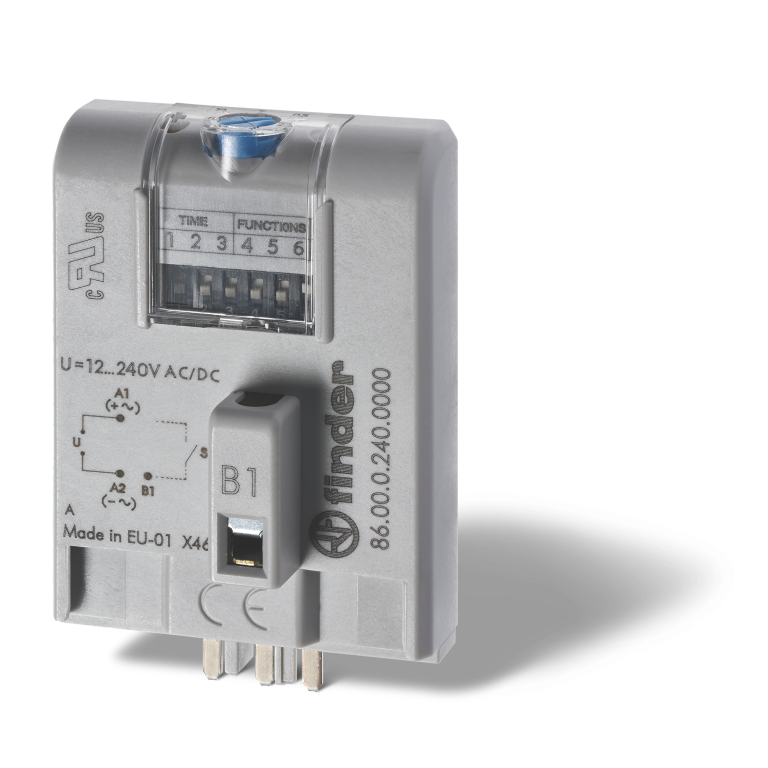 86.00.0.240.0000 Módulo temporizado multifunción. Permite trabajar con escalas de tiempo en un rango de 0.05s-100hr. Diseñado para montaje en montaje en zócalos 90.02, 90.03, 92.03, 96.04 y es compatible con los relés serie 56, 60 y 62 (no usar con rele 62.3x.x012.x300 y 62.3x.x012.x600). Cuenta con funciones de On-Delay, intervalo, accionamiento intermitente simétrico (inicio trabajo), Off-Delay (con alimentación auxiliar), On-Delay y Off-Delay (con alimentación auxiliar), intervalo al inicio del mando, intervalo al final del mando, intervalo al inicio y al final del mando. Requiere una tensión de alimentación de 12-240VAC/DC para su funcionamiento. Para más información, favor de consultar la ficha técnica del producto.