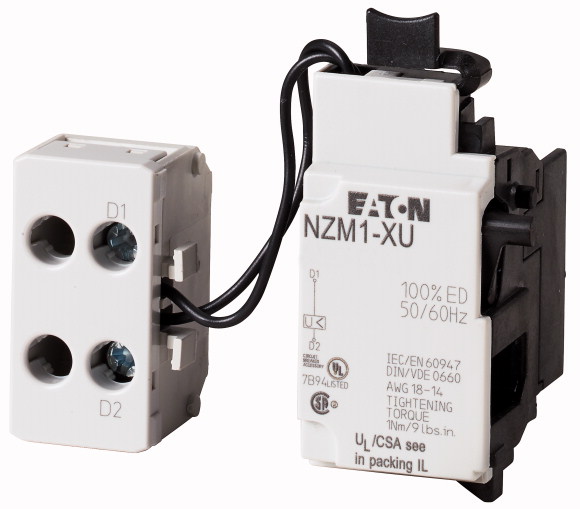 NZM1-XU24AC Disparador de mínima Tensión, sin contactos auxiliares y con bloque de terminales en el lado izquierdo del interruptor. Tensión de control: 24VCA. Indicado para usarse con: NZM1(-4), N(S)1(-4). Tamaño 1.