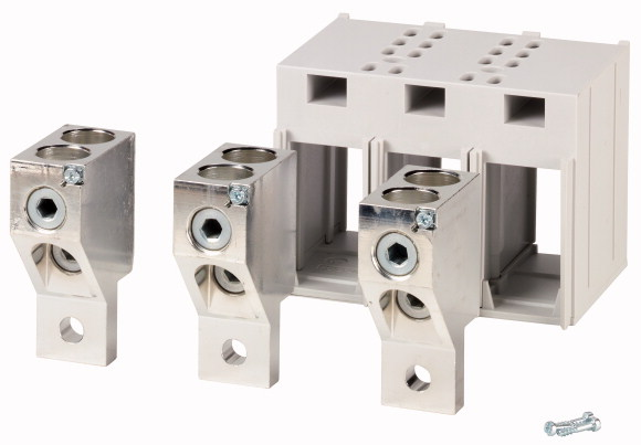 NZM3-XKA2 Terminales de conexión tipo túnel, para 3 polos. Corriente nominal 630A a 690VCA. Indicado para usarse con: NZM3, PN3, N(S)3. Capacidad de terminal (AWG/kcmil): 1x0-500MCM,2x0-500MCM. Tamaño 3.