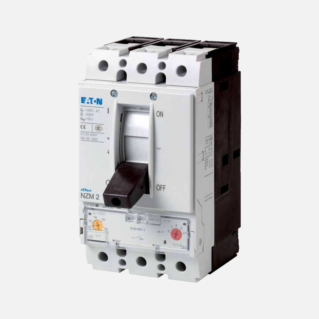 NZMH2-A100 Interruptor termomagnético trifásico de caja moldeada para protección de sistema y cables. Corriente nominal: 100A. Ajuste de sobrecarga: 80-100A. Ajuste cortocircuito: 600-1000A. Capacidad interruptora alta: 150kA. Dimensiones: 206HX105WX149Dmm. Grado de protección: IP20.