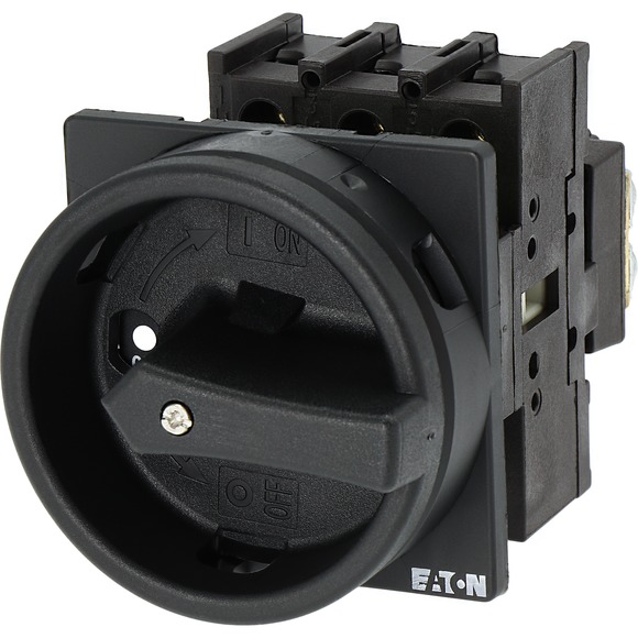P1-32/EA/SVB-SW Interruptor-seccionador principal, usado como paro de mantenimiento y/o reparación. Con manija giratoria negra y anillo de bloqueo, bloqueable en posición 0 (off). 3 polos. Corriente nominal: 32A. Potencia bajo clasificación del motor AC-23A: 15Kw a 440 VCA. Montaje: empotrar. Angulo de operación: 90°. Grado de protección IP: IP65.