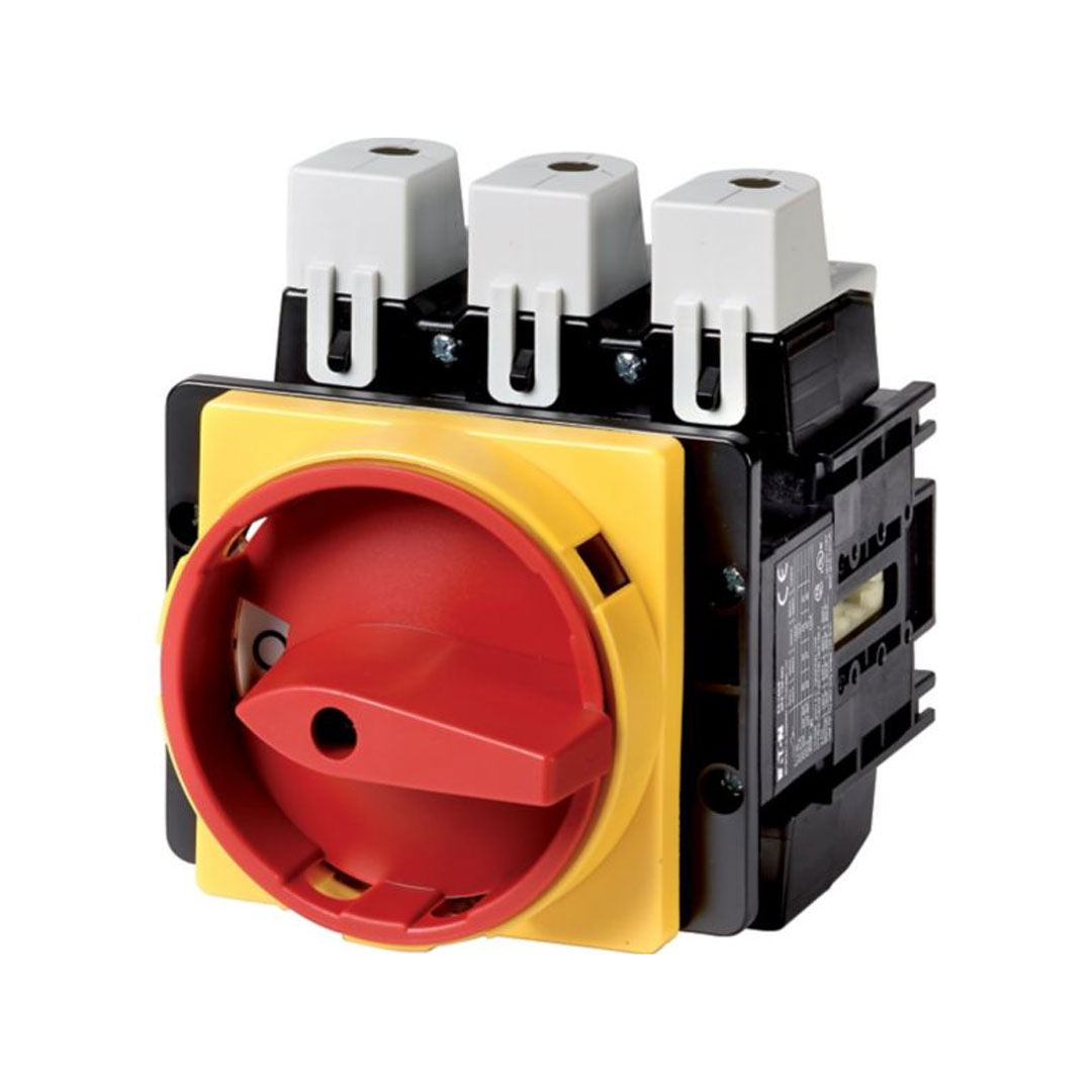 P5-250/EA/SVB Interruptor-seccionador principal, usado como paro de emergencia, mantenimiento y/o reparación. Con manija giratoria roja y anillo de bloqueo amarillo, bloqueable en posición 0 (off). 3 polos. Corriente nominal: 250A. Potencia bajo clasificación del motor AC-23A: 90Kw a 440 VCA. Montaje: empotrar. Angulo de operación: 90°. Grado de protección IP: IP65.