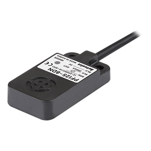 PFI25-8DN. Sensor de proximidad inductivo de cuerpo plano con diseño rectangular que puede detectar objetos a 8mm de distancia. Las dimensiones del lado de detección son 25x25mm y permite la conexión a través de un cable PVC de 2m. Se alimenta a una tensión de 12-24VCD a 3 hilos y una salida tipo NPN contacto normalmente abierto. Su frecuencia de respuesta es de 200Hz y tiene un LED Rojo que indica su estado. Está fabricado de PPS (Polisulfuro de fenileno) y es resistente al polvo y al agua (IP67). Para más información revisar la ficha técnica.