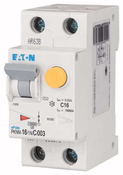 PKNM-16/1N/C/003-MW Xpole Interruptor combinado, interruptor termomagnético + interruptor diferencial (MCB+RCCB). Tipo A. Inmunizado a desconexiones intempestivas, transitorios 250 A, tipo AC. 1P+N polo(s). Corriente nominal: 16A. Corriente de falla: 30mA. Curva de disparo: tipo C. Resistencia nominal al cortocircuito: 10kA. Tensión nominal: 230/400VCA. Montaje en riel DIN IEC/EN60715. Grado de protección: IP20.
