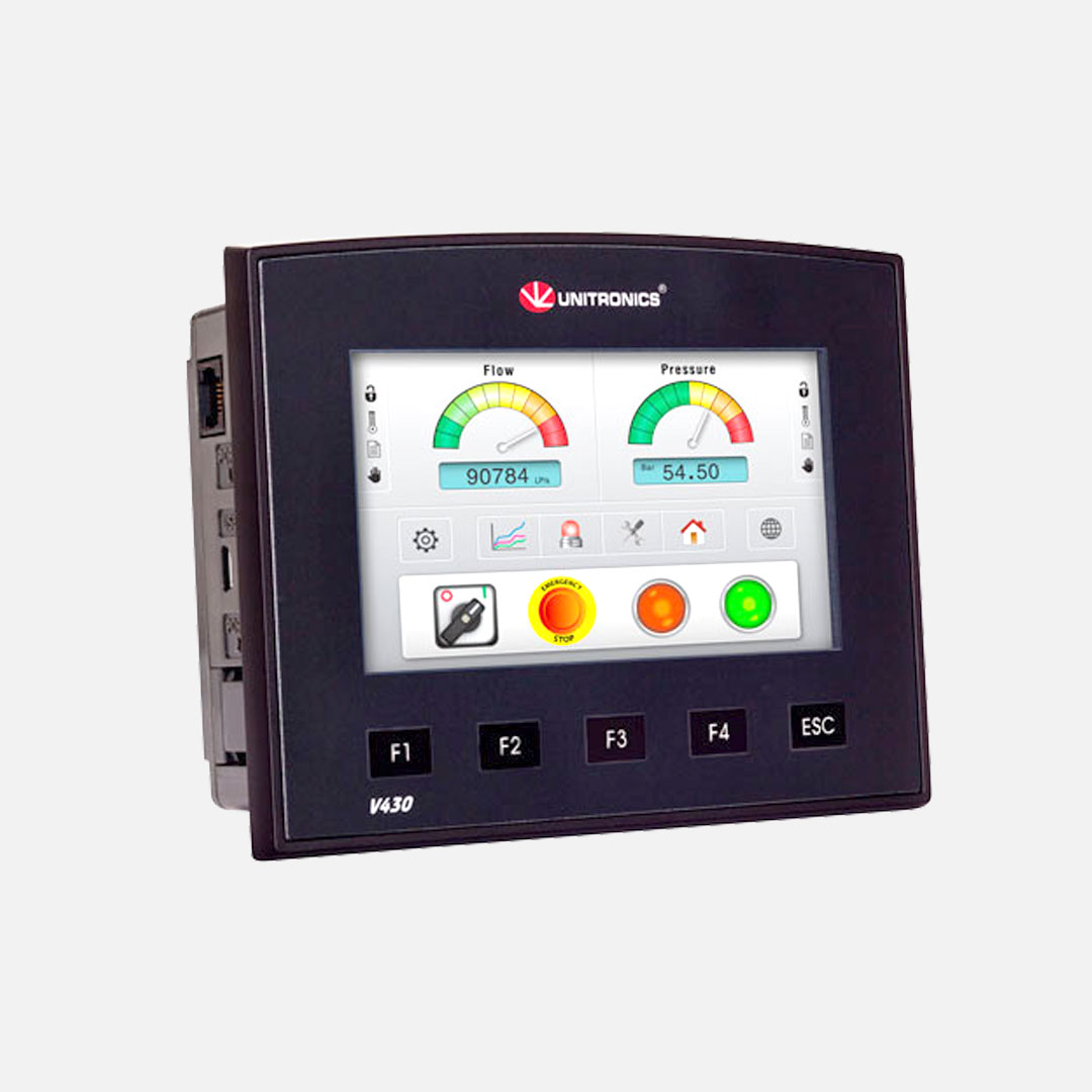 Vision430™ Controlador PLC avanzado integrado con pantalla táctil a color de 4,3? de aspecto amplio. Incluye configuraciones de E/S integradas; se expande hasta 512 E/S. Pantalla táctil (Resistivo, analógico) a color 4.3” LCD TFT (65.536 colores, resolución de 16 bits). Resolución: 480x272 píxeles. Brillo: ajustable mediante pantalla táctil o software. Cuenta con entradas: 8 entradas digitales PNP o NPN (posibilidad de configurar una entrada de contador rápido HSC de 200 kHz a 32 bits), 2 entradas digitales (NPN,PNP)/analógicas de 14 bits (0-10V, 0-20mA, 4-20mA) y 2 entradas de temperatura (PT100/TC); salidas: 8 salidas digitales tipo relé y 2 salidas analógicas de 12 bits (0-10V, 4-20mA). Tensión de alimentación: 24VCD. Características adicionales: Pantalla en varios idiomas; Pantallas de alarma integradas; PID de ajuste automático, hasta 24 bucles independientes; Programas de recetas y registro de datos a través de tablas de datos; Tarjeta Micro SD: registro, copia de seguridad, clonación y más; Bloques de funciones.