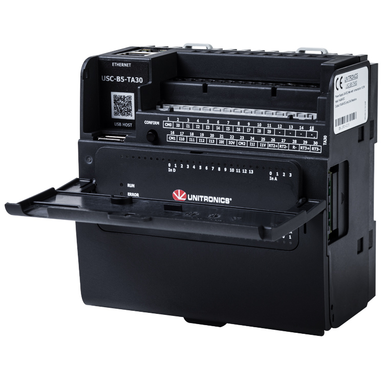 UniStream®PLC Controlador potente y sólido con: HMI (interfaz hombre-máquina) virtual. Se puede ampliar hasta 2048 entradas y salidas. Cree sus aplicaciones de PLC (controlador lógico programable) y HMI (interfaz hombre-máquina) mediante el mismo software de programación.. Memoria de aplicación: 8 MB. Cuenta con entradas: 24 entradas digitales PNP o NPN (posibilidad de configurar cuatro entradas de contador rápido HSC de 90 kHz a 32 bits) y 2 entradas analógicas 12 bits (0-10V, 0-20mA, 4-20mA); salidas: 12 salidas digitales tipo relé. Tensión de alimentación: 24VCD. Características adicionales: Ampliación local: hasta 2.048 entradas y salidas. Ampliación remota: por medio de entradas y salidas remotas de UniStream. Identificador de procesos (PID) de ajuste automático, hasta 64 lazos independientes. Registro de recetas y datos por medio de tablas de datos y muestreo. Tarjeta MicroSD: registro, respaldo, clonación y mucho más. Bloques y estructuras de funciones.