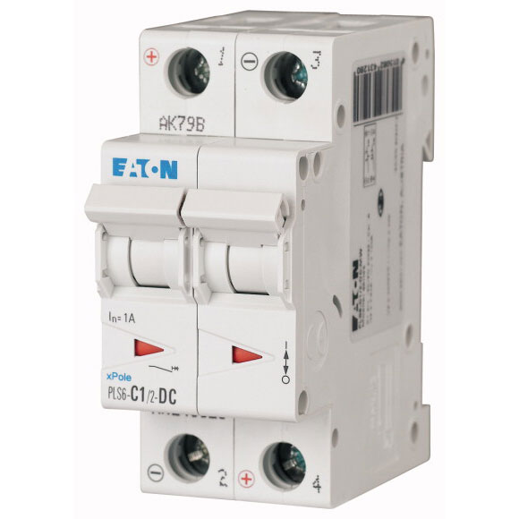 PLS6-C1/2-DC-MW Xpole Interruptor automático termomagnético (disyuntor MCB). 2 polo(s). Corriente nominal: 1A. Curva de disparo: tipo C. Capacidad interruptiva de acuerdo a IEC 60947-2: 10kA. Tensión nominal: 250VCD por polo. Montaje en riel DIN IEC/EN60715. Grado de protección: IP20.
