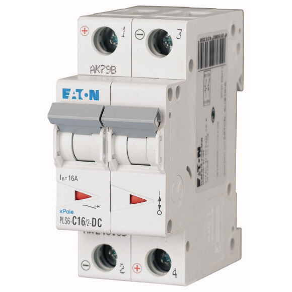 PLS6-C16/2-DC-MW Xpole Interruptor automático termomagnético (disyuntor MCB). 2 polo(s). Corriente nominal: 16A. Curva de disparo: tipo C. Capacidad interruptiva de acuerdo a IEC 60947-2: 10kA. Tensión nominal: 250VCD por polo. Montaje en riel DIN IEC/EN60715. Grado de protección: IP20.
