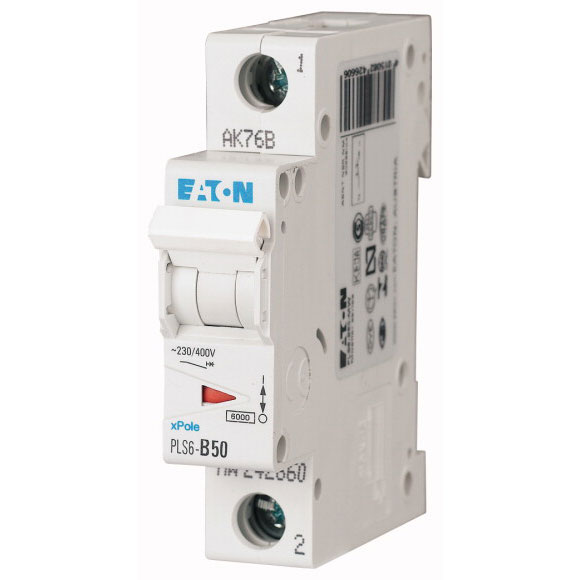 PLS6-C50-MW Xpole Interruptor automático termomagnético (disyuntor MCB). 1 polo(s). Corriente nominal: 50A. Curva de disparo: tipo C. Capacidad interruptiva de acuerdo a IEC/EN 60898-1: 6kA, IEC 60947-2: 10kA. Tensión nominal: 230/400VCA y 48VCD por polo. Montaje en riel DIN IEC/EN60715. Grado de protección: IP20.