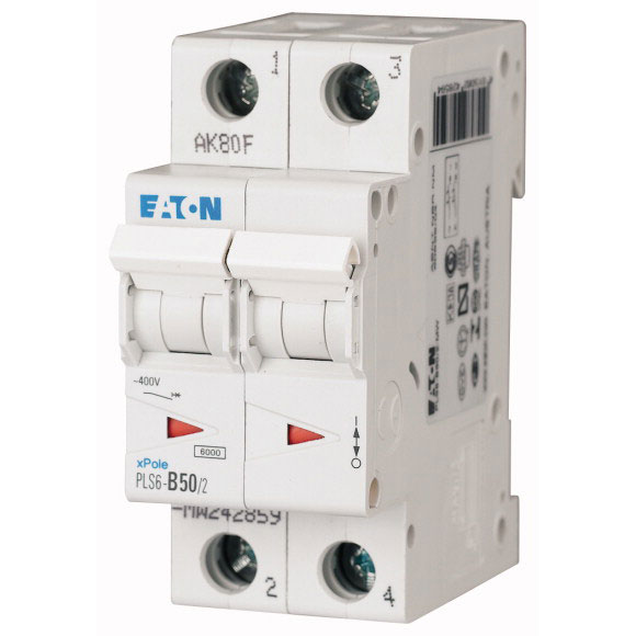 PLS6-C50/2-MW Xpole Interruptor automático termomagnético (disyuntor MCB). 2 polo(s). Corriente nominal: 50A. Curva de disparo: tipo C. Capacidad interruptiva de acuerdo a IEC/EN 60898-1: 6kA, IEC 60947-2: 10kA. Tensión nominal: 230/400VCA y 48VCD por polo. Montaje en riel DIN IEC/EN60715. Grado de protección: IP20.