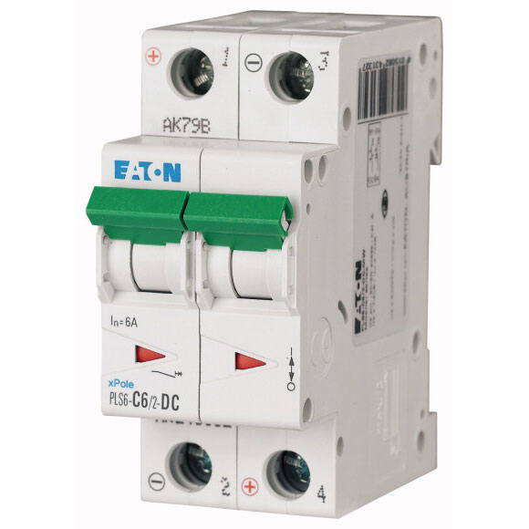 PLS6-C6/2-DC-MW Xpole Interruptor automático termomagnético (disyuntor MCB). 2 polo(s). Corriente nominal: 6A. Curva de disparo: tipo C. Capacidad interruptiva de acuerdo a IEC 60947-2: 10kA. Tensión nominal: 250VCD por polo. Montaje en riel DIN IEC/EN60715. Grado de protección: IP20.