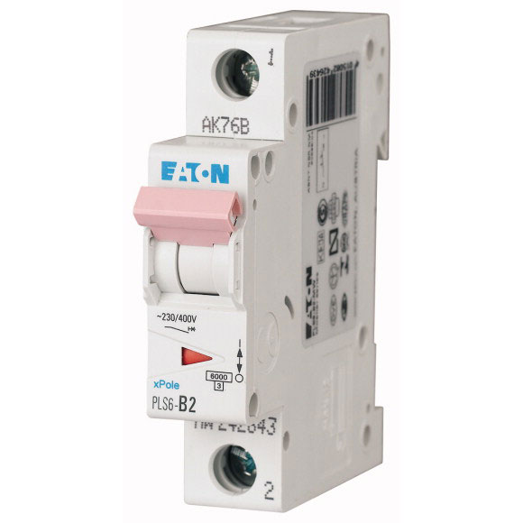 PLS6-D2-MW Xpole Interruptor automático termomagnético (disyuntor MCB). 1 polo(s). Corriente nominal: 2A. Curva de disparo: tipo D. Capacidad interruptiva de acuerdo a IEC/EN 60898-1: 6kA, IEC 60947-2: 10kA. Tensión nominal: 230/400VCA y 48VCD por polo. Montaje en riel DIN IEC/EN60715. Grado de protección: IP20.