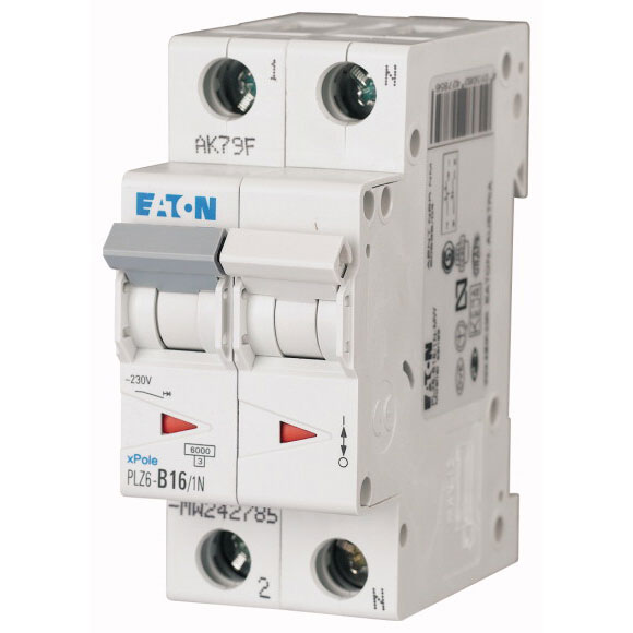 PLZ6-C16/1N-MW Xpole Interruptor automático termomagnético (disyuntor MCB). 1P+N. Corriente nominal: 16A. Curva de disparo: tipo C. Capacidad interruptiva de acuerdo a IEC/EN 60898-1: 6kA, IEC 60947-2: 10kA. Tensión nominal: 230/400VCA y 48VCD por polo. Montaje en riel DINIEC/EN60715. Grado de protección: IP20.