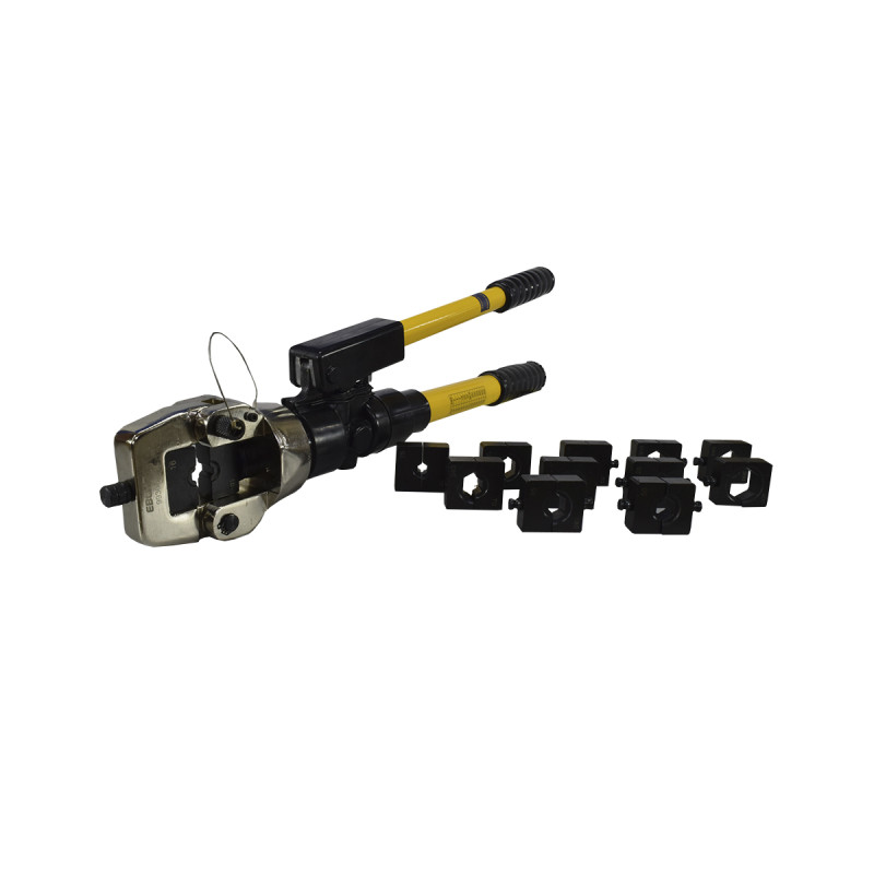 Ponchadora hidráulica de 13 Ton con mordaza cerrada y dados intercambiables-. Tipo de prensado /perfil: Conexión crimpada con engastes. Rango de sección nominal admisible: 16-400mm²(6AWG-800MCM). Estuche plástico / Cabeza giratoria.