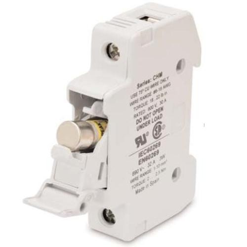 Portafusible para fusible fotovoltaico 10x38mm. 2 Polos. Indicado para una carga de 30A a una tensión de 1000V. Capacidad interruptiva de 33kA DC. Montaje a Riel DIN.