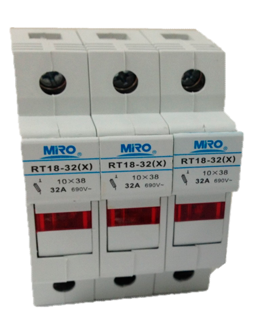 Portafusible tripolar para fusible de tamaño 10x38mm (13/32" x 1-1/2"). Indicado para una carga máxima de 32A a una tensión de 690VCA. Capacidad interruptiva de 100kA. Montaje a riel DIN.