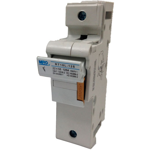 Portafusible unipolar para fusible de tamaño 22x58mm. Indicado para una carga máxima de 125A a una tensión de 690VCA. Capacidad interruptiva de 100kA. Montaje a riel DIN.