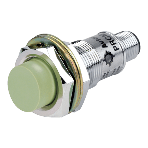 PRCM18-8AO. Sensor de proximidad inductivo con diseño cilíndrico que puede detectar objetos a 8mm de distancia. El diámetro de su cabezal es de 18mm y permite una instalación de tipo no rasante, así como conexión a través de un conector M12. Se alimenta a una tensión de 100-240VCA a 2 hilos y una salida tipo contacto normalmente abierto. Su frecuencia de respuesta es de 400Hz y tiene un LED Rojo que indica su estado. Está fabricado completamente de latón niquelado y es resistente al polvo y al agua (IP67). Para más información revisar la ficha técnica.