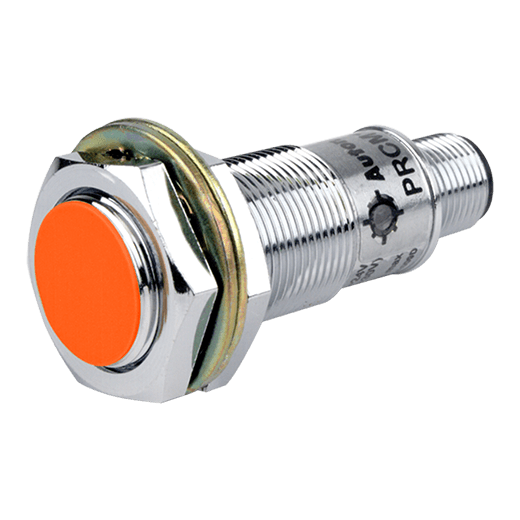 PRCMT18-5DC. Sensor de proximidad inductivo con diseño cilíndrico que puede detectar objetos a 5mm de distancia. El diámetro de su cabezal es de 18mm y permite una instalación de tipo rasante, así como conexión a través de un conector M12. Se alimenta a una tensión de 12-24VCD a 2 hilos y una salida tipo contacto normalmente cerrado. Su frecuencia de respuesta es de 350Hz y tiene un LED Rojo que indica su estado. Está fabricado completamente de latón niquelado y es resistente al polvo y al agua (IP67). Para más información revisar la ficha técnica.
