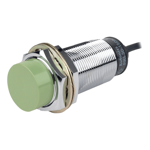 PRL30-15AO. Sensor de proximidad inductivo de cuerpo largo con diseño cilíndrico que puede detectar objetos a 15mm de distancia. El diámetro de su cabezal es de 30mm y permite una instalación de tipo no rasante, así como conexión a través de un cable PVC de 2m. Se alimenta a una tensión de 100-240VCA a 2 hilos y una salida tipo contacto normalmente abierto. Su frecuencia de respuesta es de 20Hz y tiene un LED Rojo que indica su estado. Está fabricado de latón niquelado y es resistente al polvo y al agua (IP67). Para más información revisar la ficha técnica.