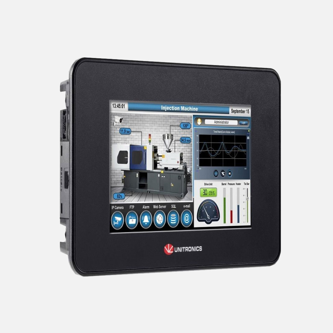 UniStream®Built-in Controlador potente y sólido con: HMI (interfaz hombre-máquina) virtual. Se puede ampliar hasta 2048 entradas y salidas. Cree sus aplicaciones de PLC (controlador lógico programable) y HMI (interfaz hombre-máquina) mediante el mismo software de programación.. Pantalla táctil (Resistivo, analógico) a color 5” LCD TFT (65.536 colores, resolución de 16 bits). Resolución: 800x480 píxeles (WVGA). Entradas y salidas no incorporadas. Tensión de alimentación: .