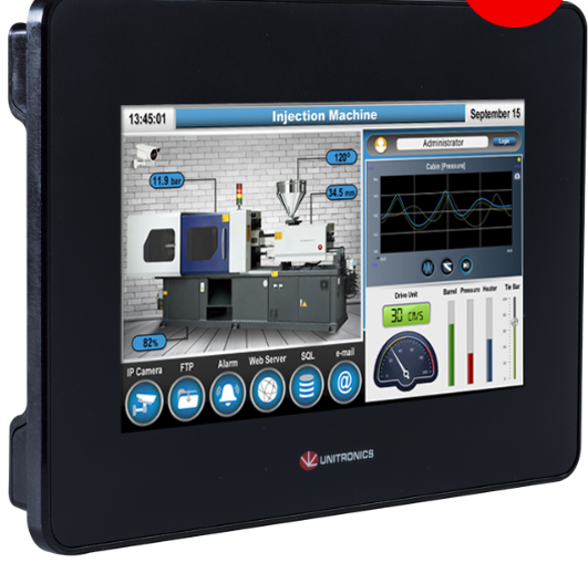 UniStream®Built-in PLC multifunción con pantalla táctil HMI integrada de alta calidad (Versión Pro), disponible en una variedad de configuraciones de E/S integradas. El perfil de hardware altamente compacto, PLC+HMI+E/S integrados en una sola unidad, ofrece potentes capacidades de control en una increíble configuración que ahorra espacio.. Pantalla táctil (Resistivo, analógico) a color 7” LCD TFT (65.536 colores, resolución de 16 bits). Resolución: 800x480 píxeles (WVGA). Cuenta con entradas: 10 entradas digitales PNP o NPN (posibilidad de configurar dos entradas de contador rápido HSC de 90 kHz a 32 bits), 2 entradas analógicas de 14 bits (0-10V, 0-20mA, 4-20mA) y 2 entradas de temperatura aisladas (Termopar, PT100/NI100/NI120/PT1000/NI1000); salidas: 8 salidas digitales tipo rele(posibilidad de configurar 2 salidas como PWM/HSO a 3kHz) y 2 salidas analógicas (0-10V, ± 10V, 0/4-20mA). Tensión de alimentación: . Características adicionales: PLC con servicios en la nube integrados y sin costo. Simplemente conecte el PLC a ‘UniCloud’, el servicio en la nube de Unitroncis, diseñe un panel de control sin código y comience a funcionar en menos de 30 minutos..