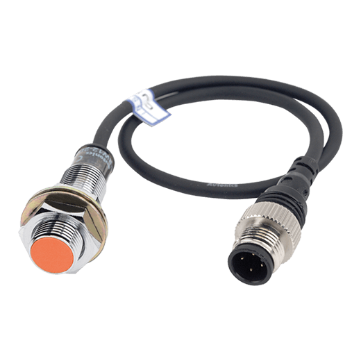 PRW12-2DP Sensor de proximidad inductivo cilíndrico tipo cable conector. Diámetro de cabezal: 12mm. Distancia de sensado: 2mm. Instalación tipo Rasante. Tensión de alimentación: 3 hilos a 12-24VCD. Salida de control: PNP contacto normalmente abierto. Frecuencia de respuesta: 1kHz. Material: latón niquelado. Con indicador LED Rojo y cable PVC de 300mm con conector M12. Grado de protección: IP67.