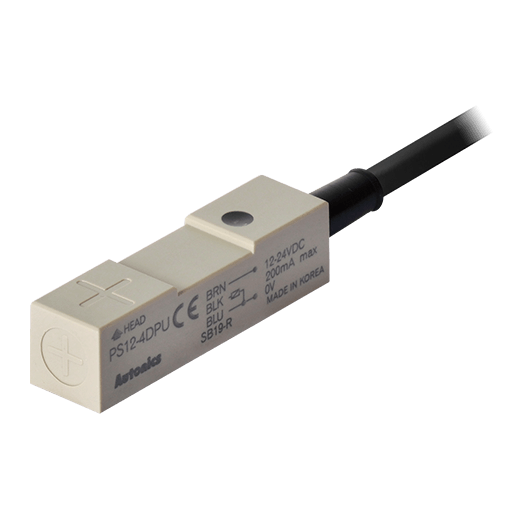 PS12-4DPU. Sensor de proximidad inductivo de detección superior con diseño rectangular que puede detectar objetos a 4mm de distancia. Las dimensiones del lado de detección son 12x12mm y permite la conexión a través de un cable PVC de 2m. Se alimenta a una tensión de 12-24VCD a 3 hilos y una salida tipo PNP contacto normalmente abierto. Su frecuencia de respuesta es de 500Hz y tiene un LED Rojo que indica su estado. Está fabricado de ABS resistente al calor y es resistente al polvo y al agua (IP67). Para más información revisar la ficha técnica.