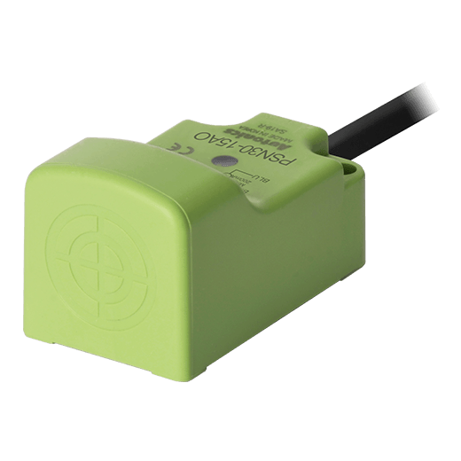 PSN30-15AO. Sensor de proximidad inductivo de detección frontal con diseño rectangular que puede detectar objetos a 15mm de distancia. Las dimensiones del lado de detección son 30x30mm y permite la conexión a través de un cable PVC de 2m. Se alimenta a una tensión de 12-24VCD a 2 hilos y una salida tipo contacto normalmente abierto. Su frecuencia de respuesta es de 20Hz y tiene un LED Rojo que indica su estado. Está fabricado de ABS resistente al calor y es resistente al polvo y al agua (IP67). Para más información revisar la ficha técnica.