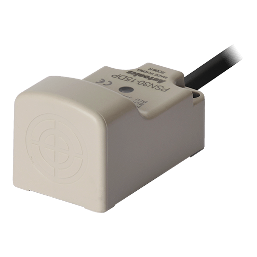 PSN30-15DP. Sensor de proximidad inductivo de detección frontal con diseño rectangular que puede detectar objetos a 15mm de distancia. Las dimensiones del lado de detección son 30x30mm y permite la conexión a través de un cable PVC de 2m. Se alimenta a una tensión de 12-24VCD a 3 hilos y una salida tipo PNP contacto normalmente abierto. Su frecuencia de respuesta es de 200Hz y tiene un LED Rojo que indica su estado. Está fabricado de ABS resistente al calor y es resistente al polvo y al agua (IP67). Para más información revisar la ficha técnica.