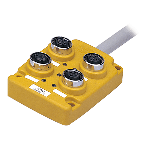 PT4-3DP Serie . Distribuidor pasivo para sensores y actuadores PNP. Equipado con 4 estaciones enchufables de conector hembra M12 de 4 polos. Diseñado para una carga de 2A a 12-24V. Cable de 5mt de extensión con asilamiento de PBT (polibutileno tereftalato). Temperatura de trabajo de -25°C~75°C. Grado de protección IP67.