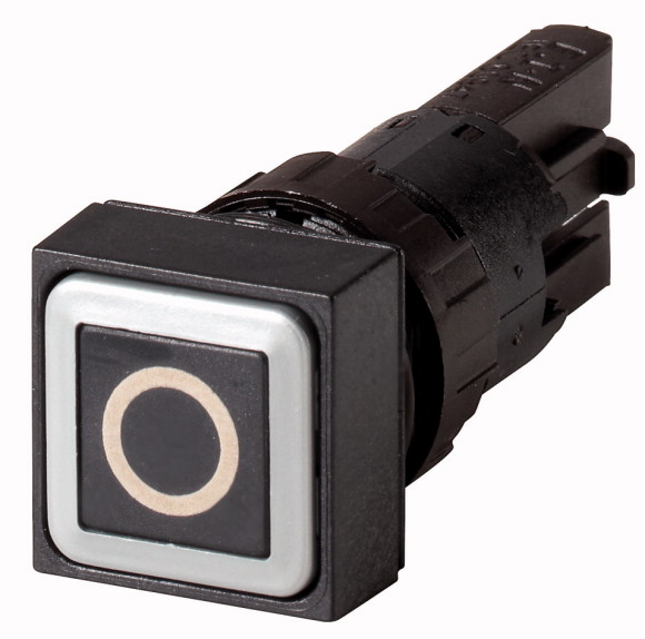 Q18D-19 RMQ16 Botón cuadrado con inscripción -0-. Dimensión frontal: 18x18mm. Para orificio de montaje de 16mm de diámetro. Diseño plano con accionamiento momentáneo. Color negro con bisel color negro. Unidad básica (requiere módulos de contacto). Grado de protección IP65.