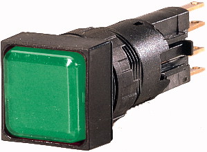 Q18LF-GN/WB RMQ16 Indicador luminoso cuadrado tipo luz piloto. Dimensión frontal: 18X18mm. Para orificio de montaje de 16mm de diámetro. Diseño plano. Color verde. Unidad completa (con bulbo de filamento a 24V). Grado de protección IP65.