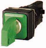 Q18S3R-GN RMQ16 Selector cuadrado 3 posiciones, accionamiento con llave. Dimensión frontal: 18X18mm. Incluye llave con posibilidad de extracción en las posición -I-0-II-. Para orificio de montaje de 16mm de diámetro. Accionamiento mantenido con ángulo de movimiento a 45°. Color verde. Unidad básica (requiere módulos de contacto). Grado de protección IP65.